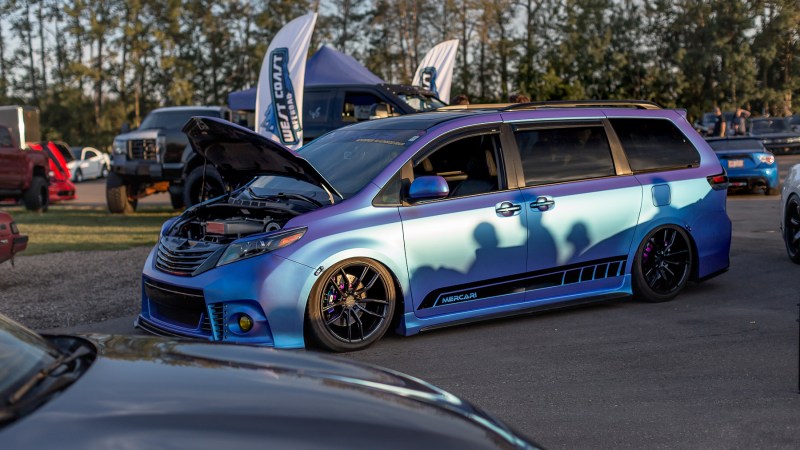 VIP minivans have been growing more widespread at the shows and Mercari Auto brought this Toyota Sienna out. Big brakes, an HKS air box, custom wrap, lowered and of course a custom set of wheels made me stop to check it out.